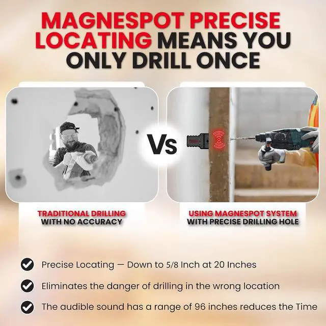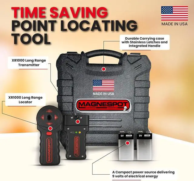 OUTSTANDING PERFORMANCE: The maximum range of the magnespot reference point locator kit between the transmitter and receiver is in excess of 60 inches, so as to cover even the biggest structures. The audible sound has a range of 96 inches which reduces the time required to locate the transmitter. The center reference is one inch below the pin's moving face when the transmitter is positioned on its sides. Eliminates the danger of drilling in the wrong location.