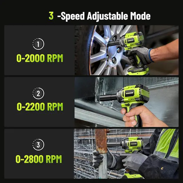 Adjustable Speed Control: The 1/2 impact wrench features a bottom switch, supports 3 speeds from 0-2000/2200/2800RPM adjustment to meet different working demands, improve efficiency, and save battery power. It can also be adjusted clockwise or counterclockwise rotation through the side button. When reverse rotation, pushing the switch button can trigger the brake stop function, no need to worry about your nuts and bolts falling or damaged after loosening