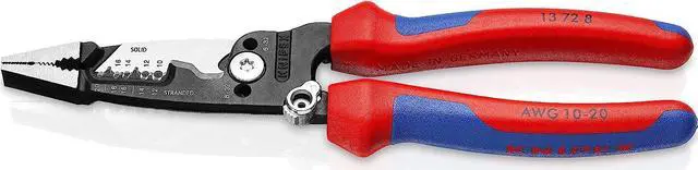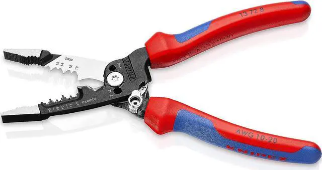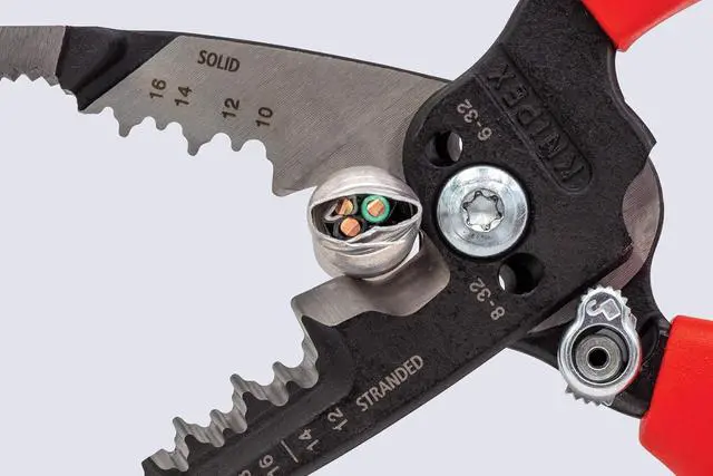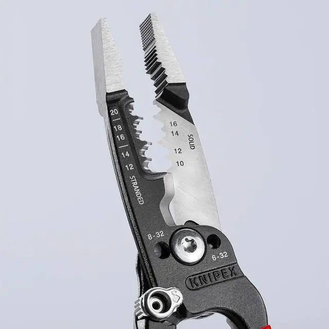 KNIPEX Tools new patent pending Forged Wire Stripper is a true game changer. It strips solid and stranded wire 10-20 AWG. Wire locating ridges make it easy to find stripping holes. It cuts 6-32 and 8-32 screws without threading from either the front or back of the tool. Cutting blades are designed to cut individual wires, NM-B, BX/MC, and battery cable. Lock can be used either right or left handed. Knurled tip and wide flat jaws for better grip. Also includes wire looping groove and gripping area for pipes.