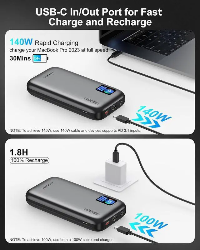 [Universal Compatibility]: The AsperX 140W power bank is compatible with a wide range of devices and supports the most common fast charging protocols, including PD 3.0, QC 3.0, PPS, AFC, and UFCS. It allows you to quickly charge your phone, laptop, tablet, game console, and camera.