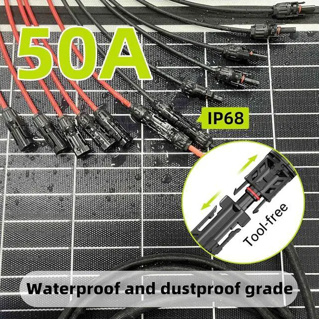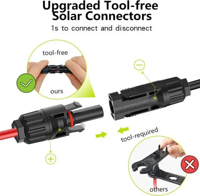 Plug and Play: The Tool-free Solar Panels Connectors cable features secure and reliable connectors that ensure a tight and stable connection between the cable and your solar panels or device, and you can link and disconnect quickly, without any tool assistance. This secure connection minimizes the risk of electrical issues or disconnections, promoting the safety and efficiency of your solar energy system