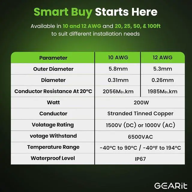 Multiple Options Available: Choose from various wire gauge sizes (10, 12 AWG) and length options (20ft, 25ft, 50ft, 100ft) to fit your specific solar panel system needs.
