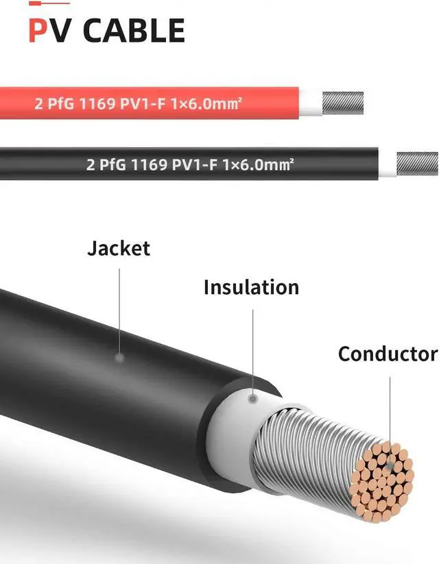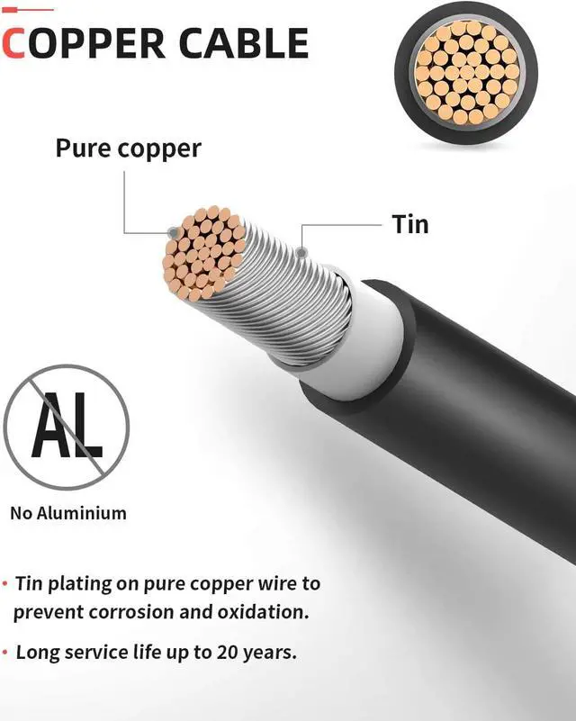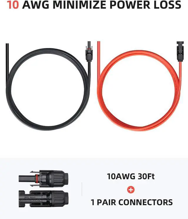 Solar panel cable is typically sold in 14, 12 and 10 AWG sizes. The solar panel cable offered in this listing is 10 AWG which is the largest diameter of the three. Using large diameter cable minimizes power loss in your solar panel system.