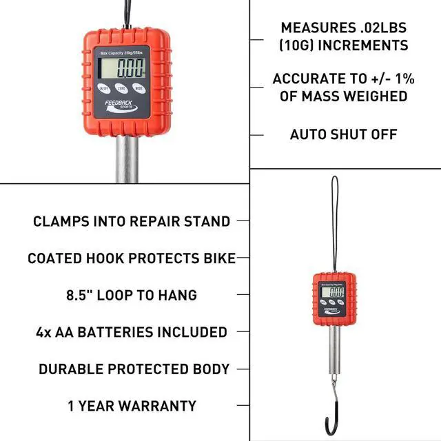 Since the invention of the bicycle theres been one constant... How much does it weigh? Whether its a wheelset, frameset, tool set, or whatever else riders get fixated on, weight matters. The Alpine Scale was the first Feedback Sports product and it was the first scale of its kind to be built (and patented) specifically to be clamped in a bike repair stand. With unmatched consistency and precision, ability to go quickly between pounds decimal, pounds and ounces, grams and kilograms, this is your hang scale of choice.