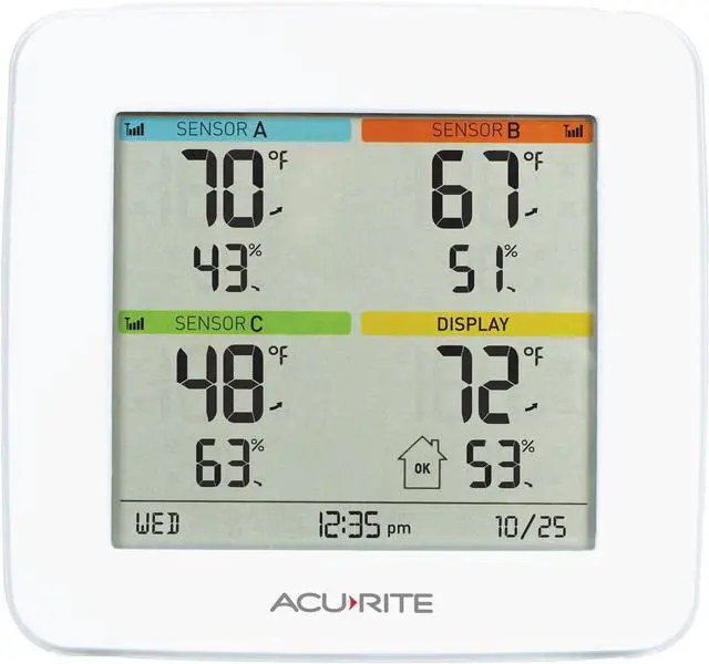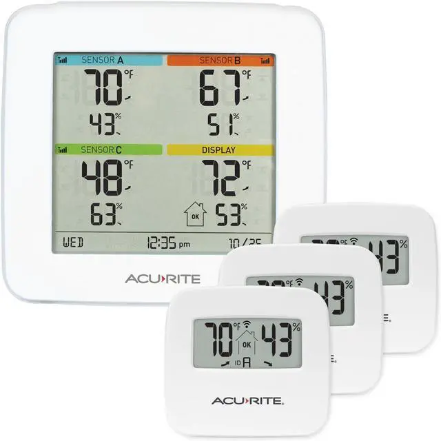 Stay informed about the environmental conditions affecting the places and things you care about. With an AcuRite indoor multi-sensor station with 3 sensors, you can accurately monitor temperature and humidity in four locations inside your home. Thanks to its wide variety of features and functions, you can enjoy reliable, actionable Information empowering you to keep your home safe and in top condition. Simply pair the digital display with the three included wireless sensors. Each temperature and humidity sensor has a built-in display, digital thermometer and hygrometer to measure indoor environmental conditions with precision and accuracy.