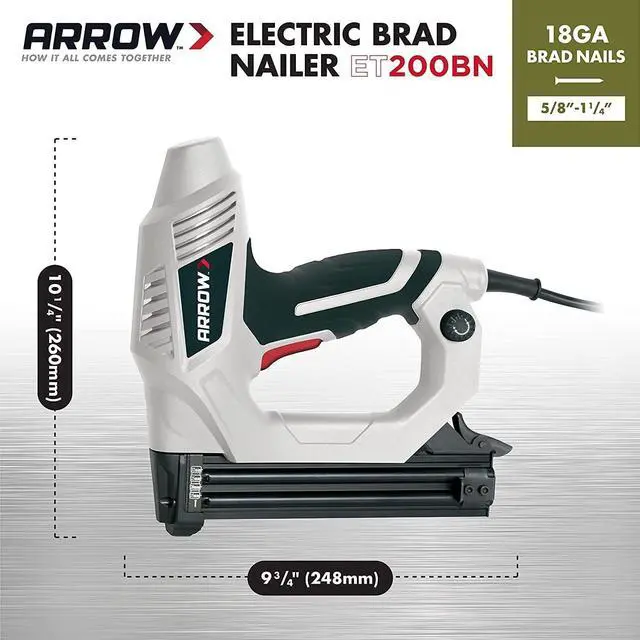 The Arrow ET200BN Nail Gun makes any small construction job quicker and easier. Ideal for general wood repairs, trim, and lattice work, this nailer features an adjustable depth-control knob that allows the operator to set the correct amount of power for any type of job. The comfortable, soft-grip handle reduces hand fatigue from repeat use, and the six-foot power cord allows more freedom to move around while working. Designed to withstand the demands of any jobsite, the oversized trigger allows the operator easy access for harder to reach areas. With an adjustable impact-control nozzle and a convenient quick-release magazine, the Arrow ET200BN Nail Gun is built for speed and convenience.