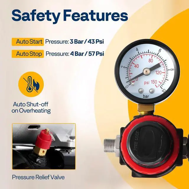 SAFETY ASSURANCE - Designed with an automatic shut-off mechanism to keep the motor for overheating; Additional safety protection devices are built-in for the air tank as well