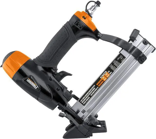 The Freeman PFBC940 Pneumatic 4-in-1 18-Gauge 1-5/8" Mini Flooring Nailer / Stapler is the ultimate tool for installing flooring as well as tackling finish work. Use the 45 degree angle nose attachment to install engineered or solid hardwood tongue and groove flooring, or remove it for applications such as decorative trim, moulding, cabinetry, paneling, upholstery, insulation, plastic sheeting, window casing, furniture trim, picture frame assembly, and hobbies and crafts. This durable and lightweight air powered nail gun is built to last and features tool-free depth adjust, quick jam release, a reload indicator, an ergonomic body, a comfort grip handle, and 360 degree adjustable exhaust. The Pneumatic 4-in-1 18-Gauge 1-5/8" Mini Flooring Nailer / Stapler will increase the productivity of DIYers tackling home improvement and repair projects as well as construction contractors at the jobsite, and is covered by Freeman's 7 Year Limited Warranty and 90 Day Wearable Parts Warranty.