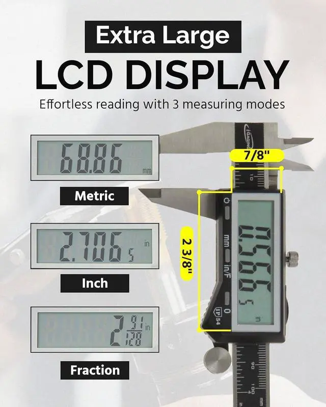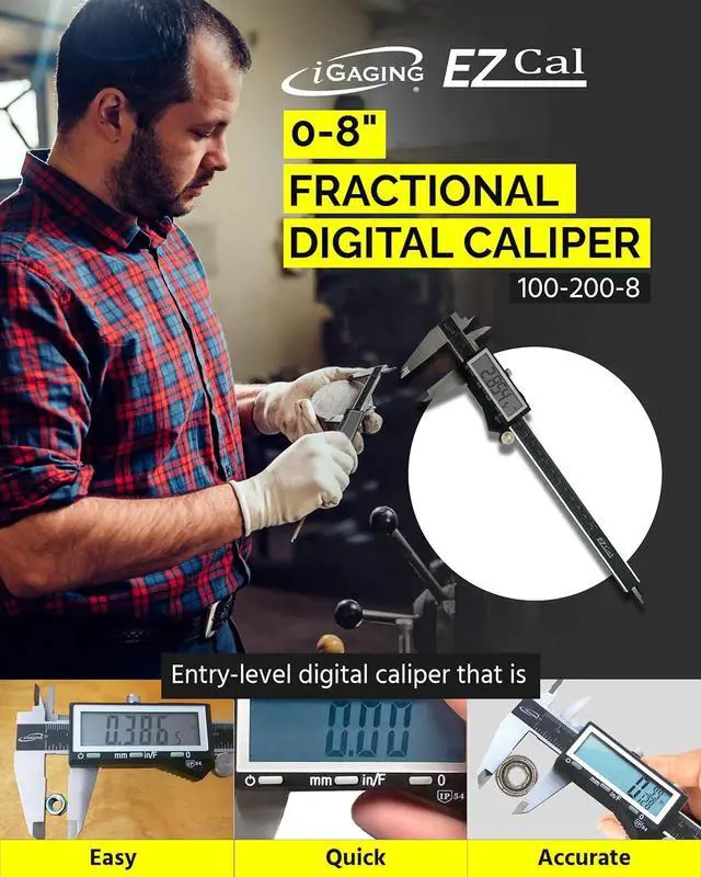 iGAGING EZCal Digital Caliper 0-8"/200 mm - IP54 Electronic Caliper with Extra-Large LCD Display - Quick & Accurate Measurements in Inch, Metric, & Fraction Modes - Includes Case, Manual, & Battery
