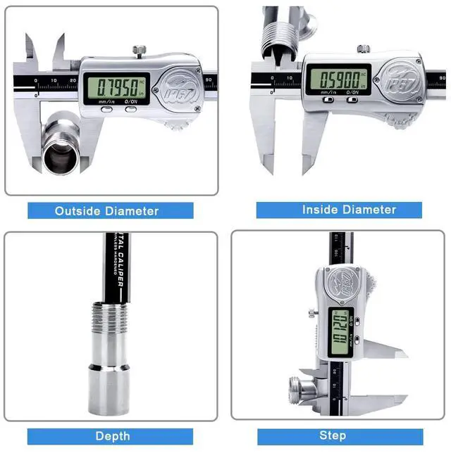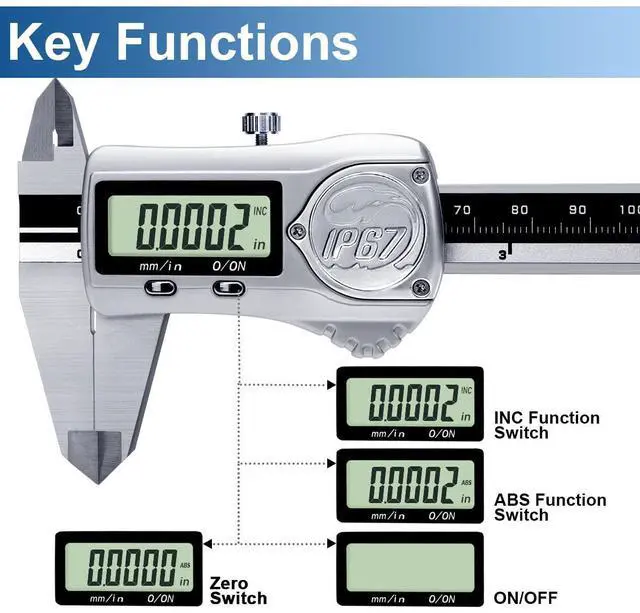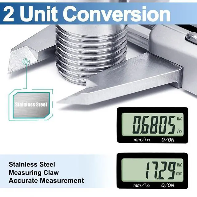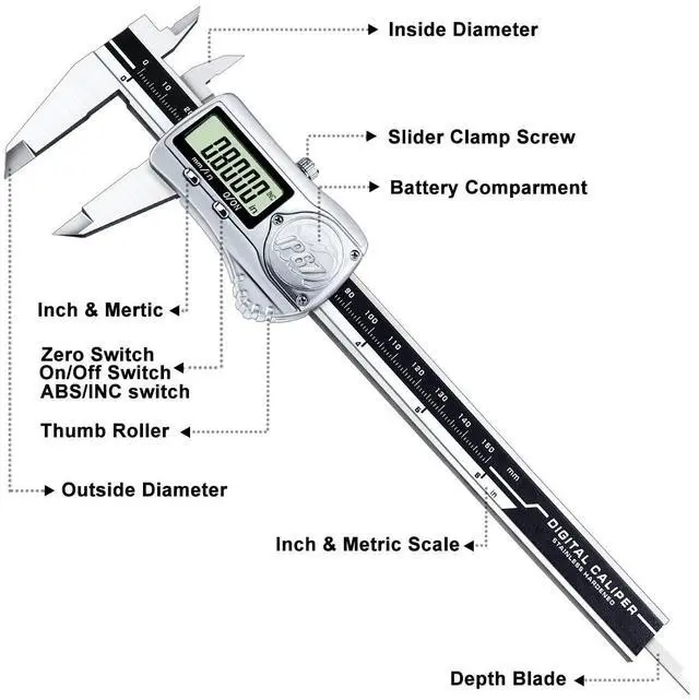 4 Measuring WaysThis digital vernier dial caliper is easy to measure depth, step, external and internal diameter, making all your objects measurable. 3 batteries are provided: one installed and other two as spare batteries. Auto shutdown for saving battery after within 6 minutes if without operation.