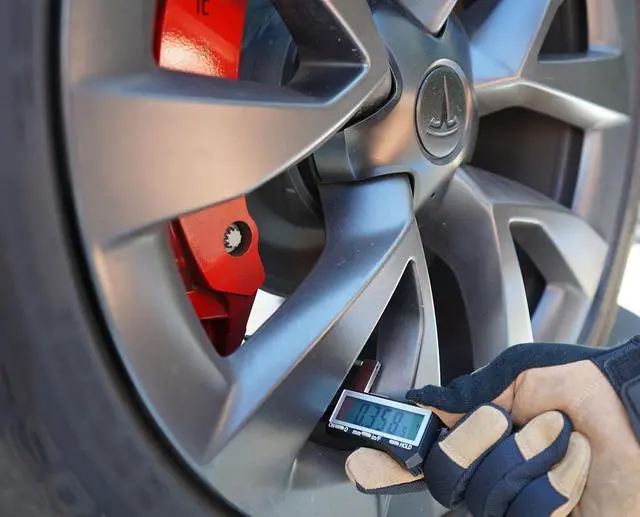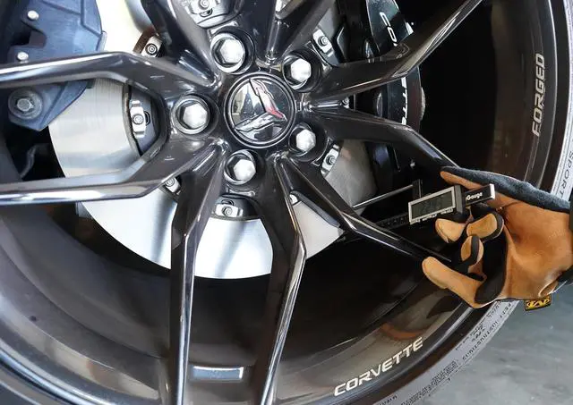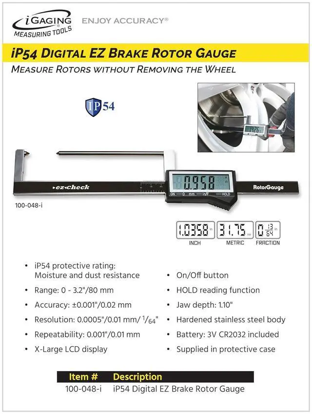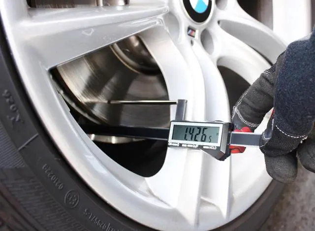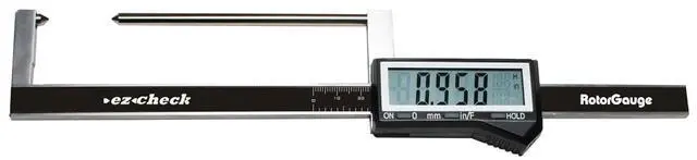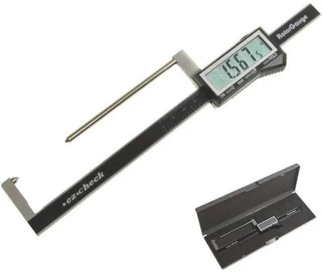 Engaging, the professionals choice brake rotor gauge wheels on. Igaging wheel on rotor gauge measures the rotor without removing the wheel.