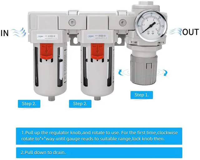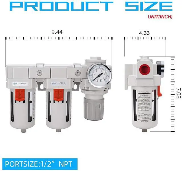 Temperature Range: 41-140 (5-60Flow Rate: 105 SCFM (3000 L /Minute)@ 90 PSI Includes Semi-Auto Drain & Polycarbonate Bowl with Metal Guard, 0-150 Gauge & Bracketa pair of Air Coupler Plug Kit, 2 x 1/2" NPT Fittings, 1 x Thread Seal Tape