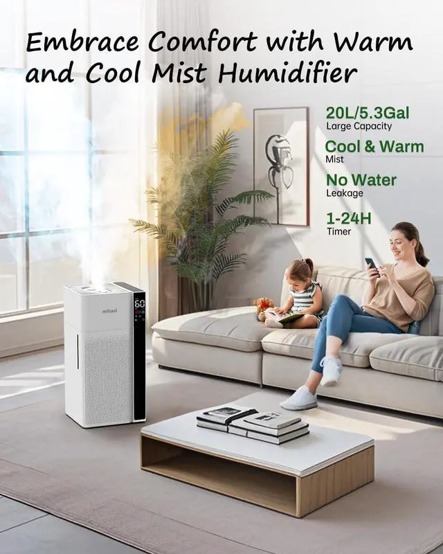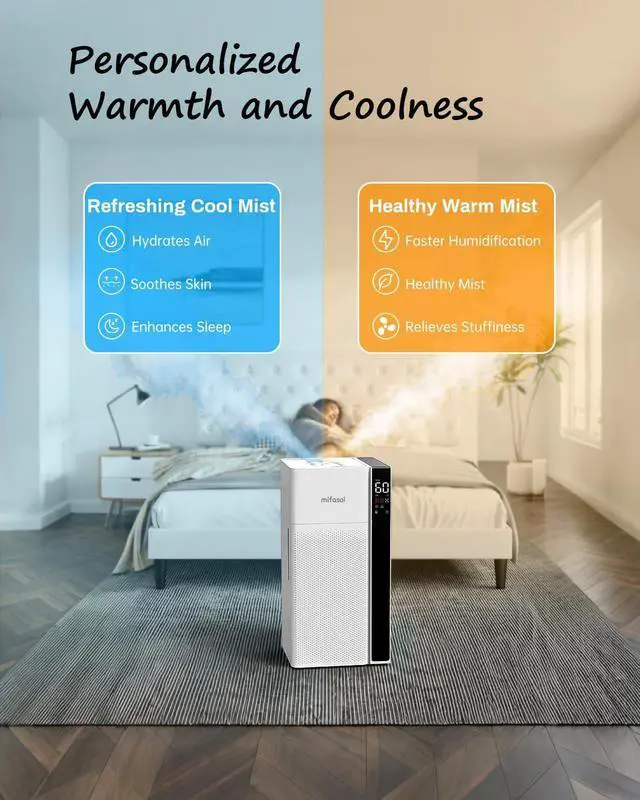 3: Customize your comfort with this air humidifier featuring 3 mist modes and an adjustable humidistat. Ideal as a whole house humidifier or for bedrooms, offices, and large spaces, it offers low, medium, and high mist speeds with a constant humidity range of 45%90%. Enjoy faster, safer warm mist that reaches 104°F in just 5 minutes. Set your schedule with a 124H timer or switch to sleep mode for effortless overnight use.