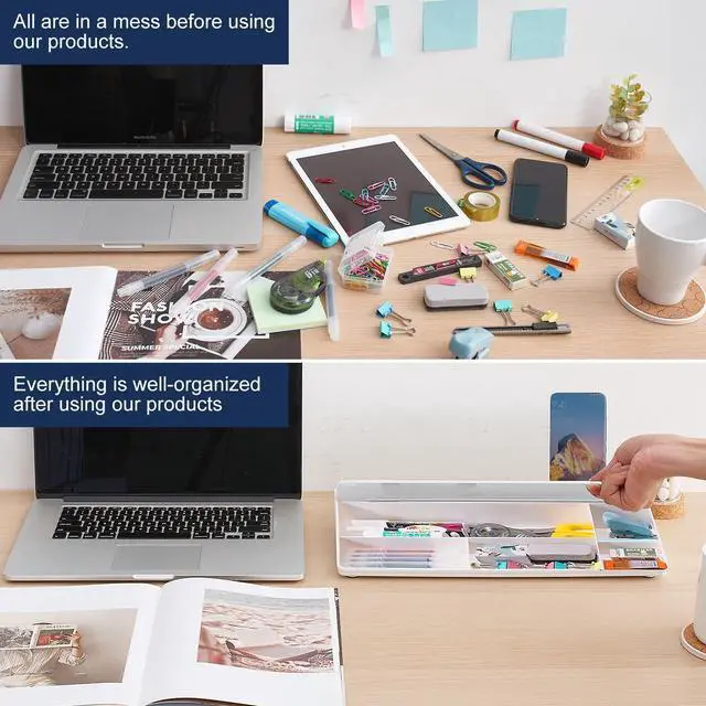 HIDDEN STORAGE & MOBILE TRAY: De-clutter your desk by storing markers, magnetic eraser and other desktop accessories in the opening drawer or place markers on the accessory tray for quick access. And one more long tray on the top of the dry erase white board for your pad or mobile.