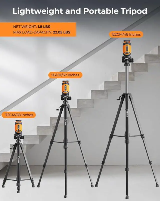 Magnetic Base & Tiny Size: The CIGMAN laser level is equipped with a magnetic base, which can be directly adsorbed on any metal surface. The included strong L magnetic bracket can also be attached to the metal surface and rotate the laser level 360°. Besides, our laser level tool is lightweight, palm-sized design, easy to carry and IP54 waterproof/dustproof. Package includes 1x CM-505 Laser Level, 1x Storage Bag, 1x 48inch Tripod, 1x Type-C Cable, 1x User Manual