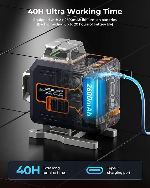 Extended Battery Life: Never worry about running out of power during critical projects. Equipped with a robust 2600mAh lithium battery and a Type-C charging port, this laser level offers long-lasting performance. It also supports operation with two chargeable lithium batteries, ensuring you have multiple options for uninterrupted use throughout the day.