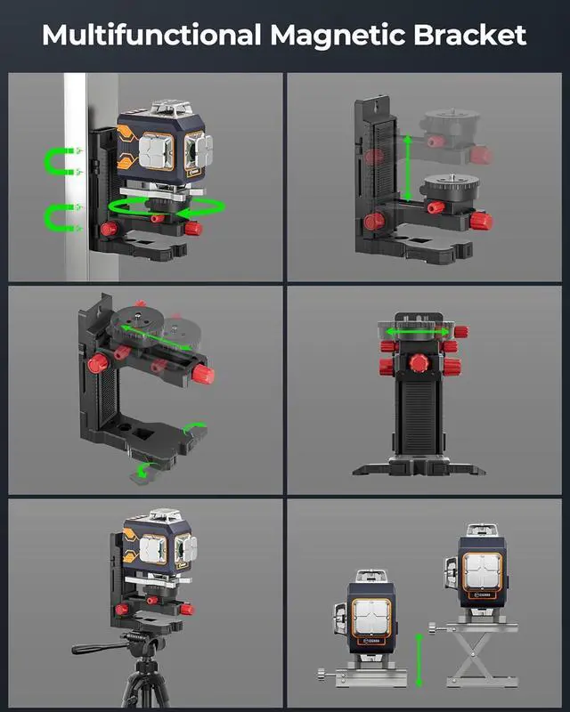 Comprehensive Accessory Kit: This laser level comes with an extensive set of accessories for enhanced functionality. Included are 2* chargeable lithium batteries, 1* USB-C charging cable, 1* multi-functional magnetic mount (with metal plates), 1* lifting base, 1* target plate, and 1* remote control. This complete accessory kit ensures you have everything needed for optimal performance in various work environments, all conveniently stored in a portable carry bag.
