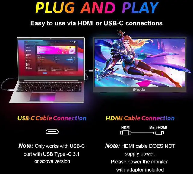 : This laptop extended monitor easily connect to phone, laptop, Xbox, Switch, PS4 and so on. It's perfect for a second monitor for gaming, working, watch movies, traveling and so on. Please note if your USB type C port is not USB 3.1 or Thunderbolt 3, the providing USB C cable ONLY have charge function, and No signal transmission function.
