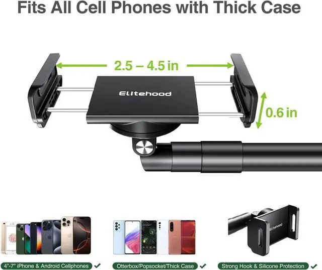 Universal Compatibility Pulled open in a range of 2.5 to 4.5 inches, this cellphone holder allows you to easily sit your iPhone 15 14 13 12 11 Pro Max Pro Xs Max Xr X 8 Plus, Galaxy S23 S22 S21 Ultra S20 Note 20 Flip ONEPLUS Motorola Moto X G Google Pixel 4 3 2 LG G6 V30 and other Smartphones with thick case on this overhead phone video stand. The protective hooks with silicone are well to protect your phone from scratching and falling off.