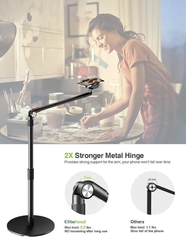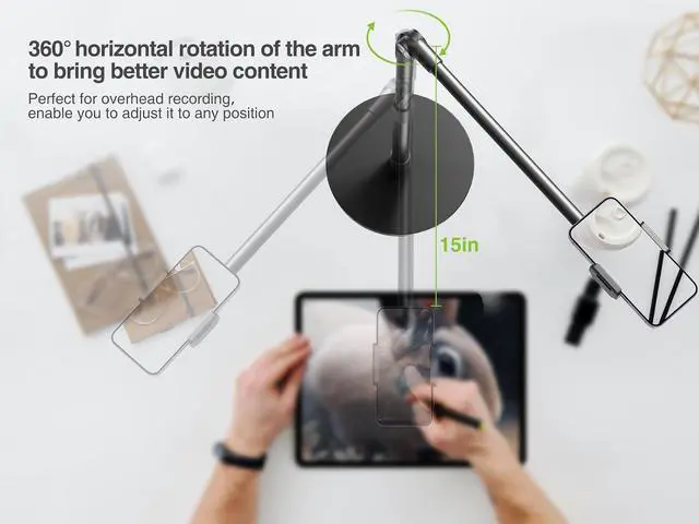 Long & Flexible Arm This 15 inches arm is long enough for all your desktop recording needs. It can be adjusted up and down and 360 degrees rotating, which make it easy to get to some hard-to-reach positions and challenging angles without the need of tools. It is your workspace, desks and kitchen counters ideal partner for filming, painting, cooking videos, document scanning, zoom meeting and more.