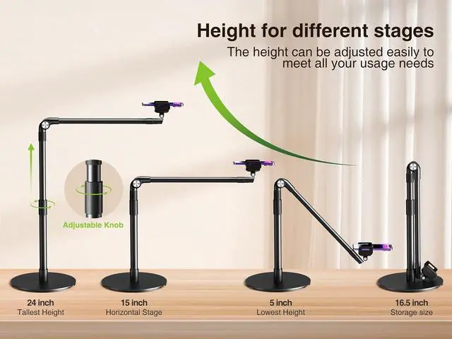 Height & Angle adjustment Height adjustable from 15 to 24 inches, this iPhone stand for video recording is allowed to position your iPhone as wish for easy viewing. With 360 degrees Rotating Hinge, you can spin your phone from landscape to portrait, to upside-down, or anywhere in-between. You just need to simply grip the phone holder then swing tilt and spin your phone into desired angle.