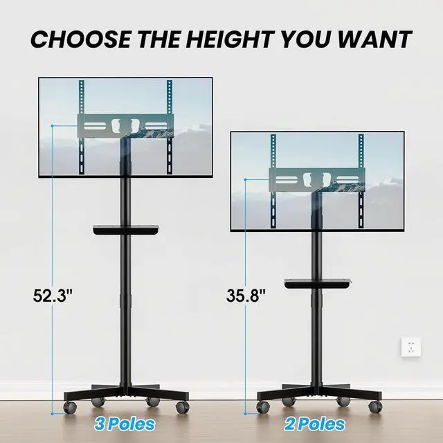 Secure Construction: Made with high-grade steel, this mobile TV cart offers reliable stability. The heavy-duty structure supports TVs up to 88 lbs, while the lockable caster wheels ensure smooth mobility and a stable base when stationary. The durable construction and safety locks provide peace of mind, keeping your TV secure in any environment.