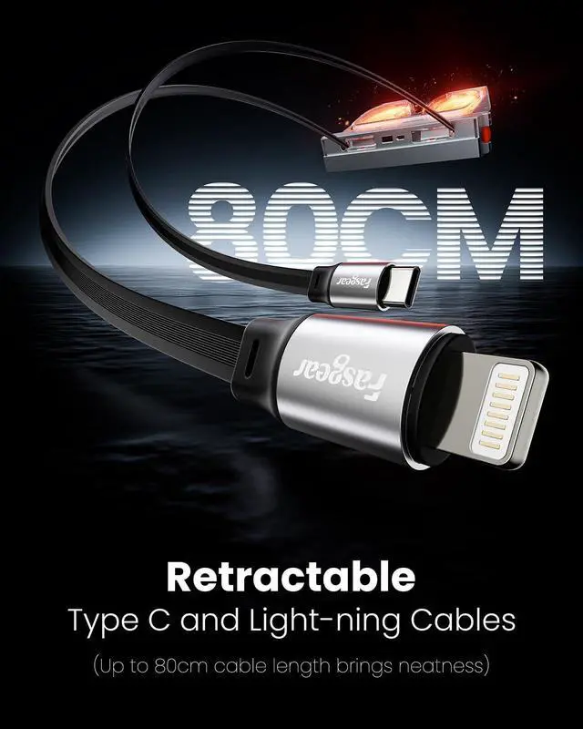 Retractable Type C and Lightning CablesOur Tesla Model y Model 3 accessories USB hub comes with 2 retractable type c and lightning cables. Maximum retractable 80cm length can satisfy the daily charging needs for the driver seat and passenger seat. Thus, our car hub can save you from finding charging cables and bring neatness.