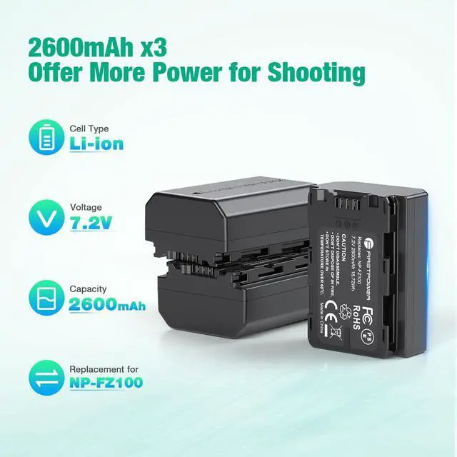 Ideal Backup Solution: 3* Replacement Sony NP-FZ100 batteries, 1* triple slot NP-FZ100 charger, 1* USB charging cable (no plug) and 1* cleaning cloth. Any question or advice please contact us