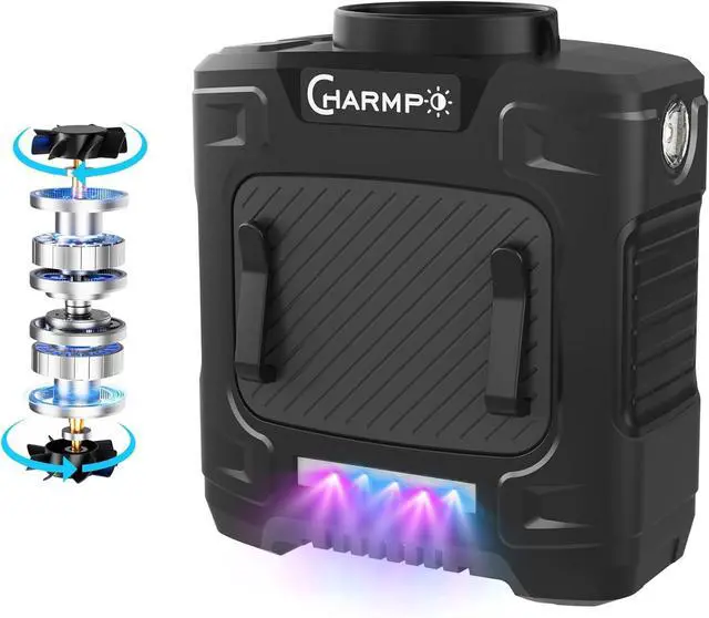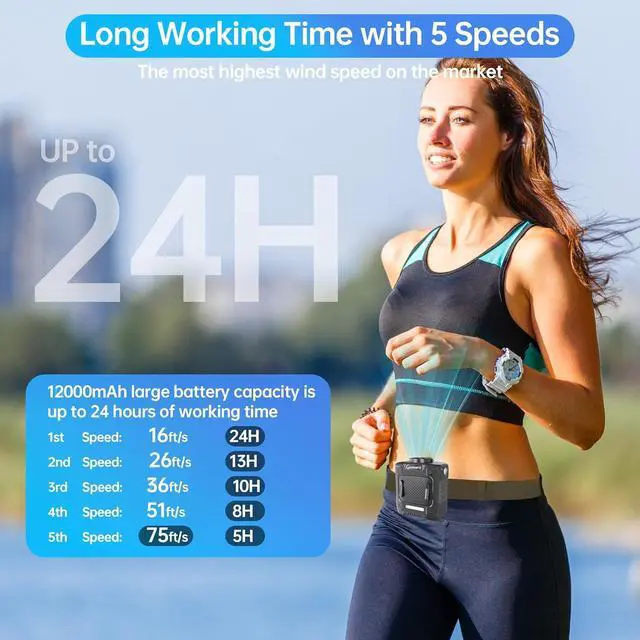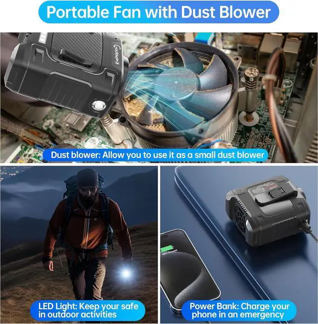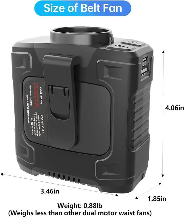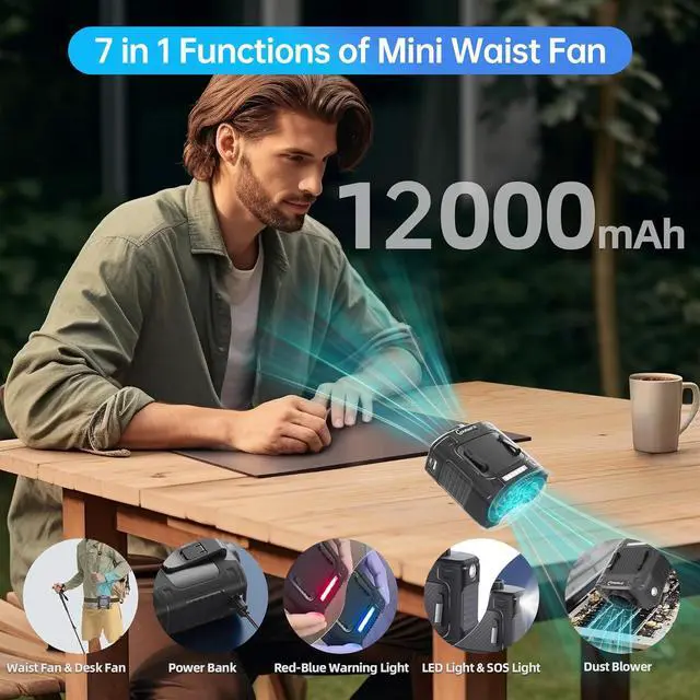 Smart Cooling Tech: This ultra-portable belt fan revolutionizes personal cooling with dual T-shirt clip anchors for snag-free operation. It integrates desktop fan cooling, a small dust blower (75ft/s airflow), a 12000mAh power bank, and multi-mode LED lighting (white work light/SOS strobe/red-blue warning). The patented aligned airflow duct design maximizes cooling efficiency by 40% compared to conventional waist fans.