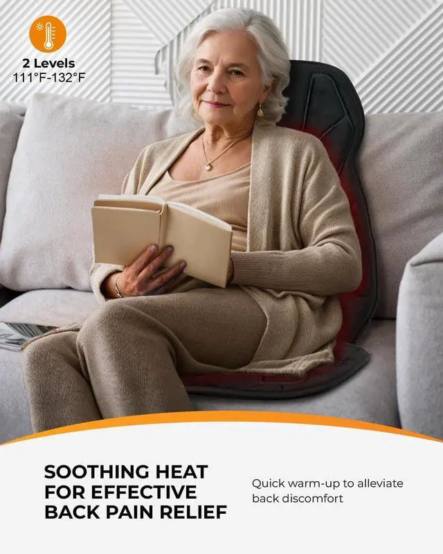 Soothing Heat & Stays Secure with Max 90-min Timer: This massage chair pad features optional heat functions with two levels, targeting the lumbar and seat areas for customized warmth and relaxation. The heat can be used independently of the massage, easing tired muscles and alleviating a cold back. Choose from 30, 60, or 90-minute auto shut-off options, with overheating protection for safe use.