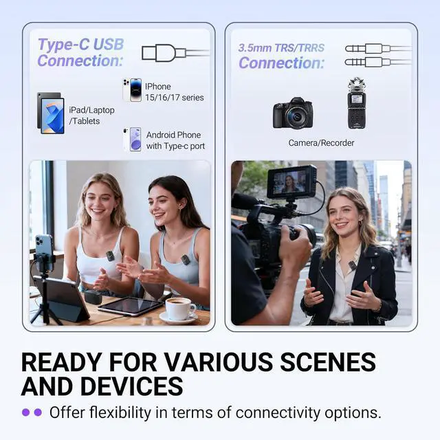 [Universal Compatibility, One Set Meet] Whether you're shooting a documentary on DSLR camera, recording a live stream on mobile type c smartphone, or conduct an interview on a laptop, the cordless mic for vlogging is compatible with Android phones or tablets, iPhone or iPad, and laptops. The external clip microphone wireless is good for content creators who work across multiple platforms or need flexibility when recording in different environments because of effortlessly switch between devices.