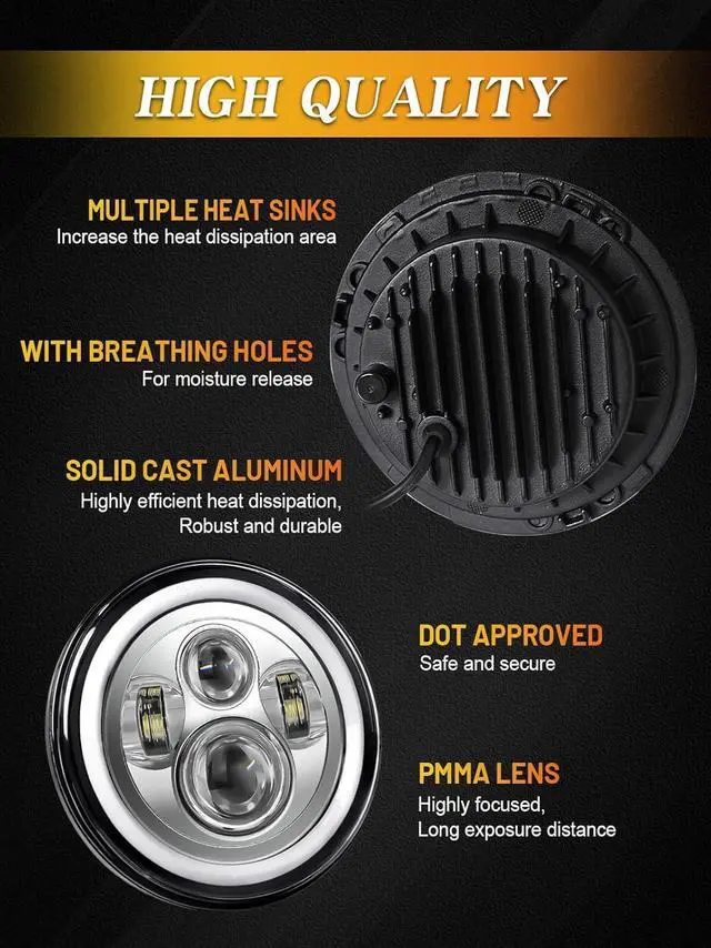 Easy installation - 7" round headlight, with H4 plug, with 2 halo wires for white DRL&amber turn signal. Install in just 20 minutes. If this is your first time installing, we recommend you visit the video site to find out about "7" LED Headlight Installation". You will be provided with installation instructions.