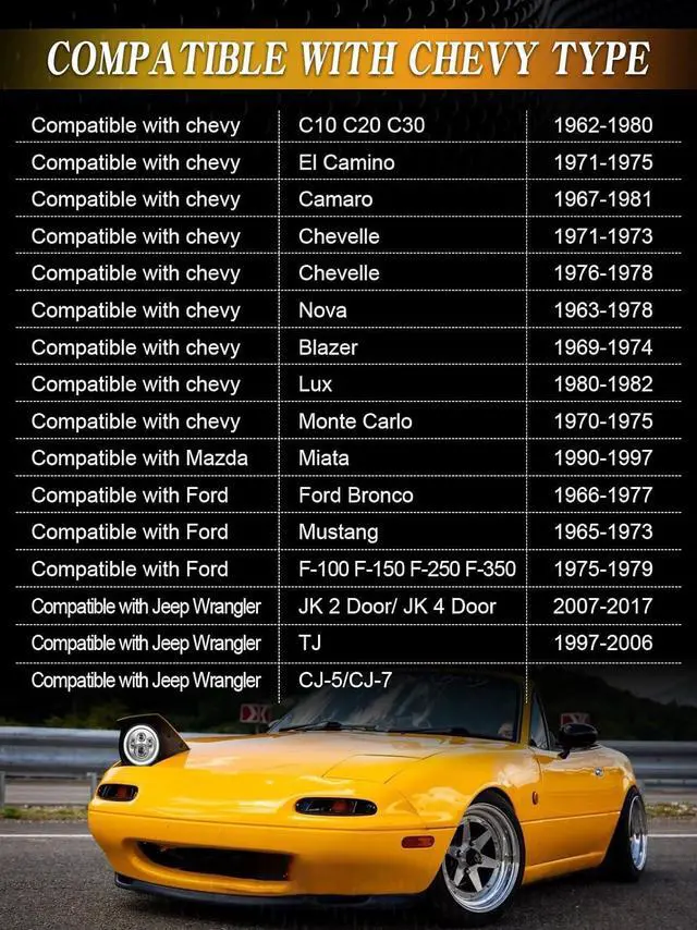 Wide application - 7" LED Headlight Compatible with Jeep Wrangler JK 4 Door Unlimited 2007-2018; Compatible with Jeep Wrangler JK 2 Door 2007-2018; Compatible with Jeep Wrangler TJ 1997-2006; Compatible with Jeep Wrangler TJ Unlimited/LJ 2003-2006; Compatible with Jeep Wrangler CJ-7 1976-1986; Compatible with CJ-8 Scrambler 1981-1985; Compatible with Chevrolet; Compatible with Mazda Miata. Fit models with standard 7" headlights, pls check your vehicle's bucket size.