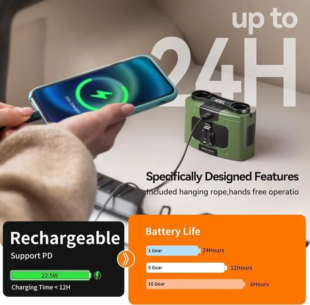 • Portable fan casing is tough enough for long-term outdoor or indoor use.It features a stronger motor, added protective silicone sleeves, emergency charging for mobile phones, and an upgraded manganese steel clip.
