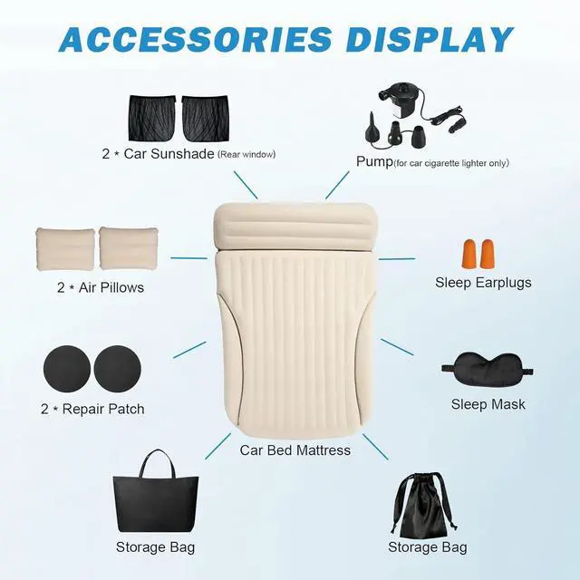 Compact and Easy to StoreOur colchón inflable para carros comes with a lightweight carrying bag for easy transportation. When it's time to pack up and move on, simply pull out the air valve and use the portable pump to automatically and quickly release the vacuum in 2 minutes. This saves a lot of time and is very organized. Just put suv mattress camping bed in the trunk of your car and take it with you. Ideal for Road Trip, Car Travel, Camping and Guest Beds