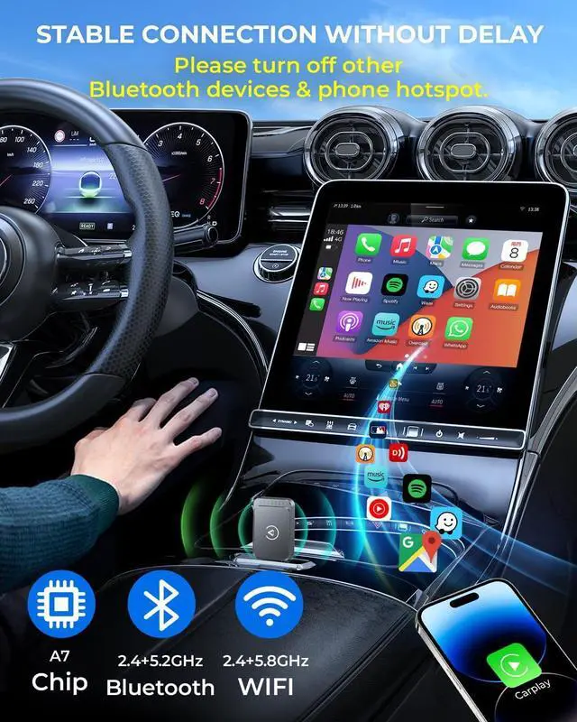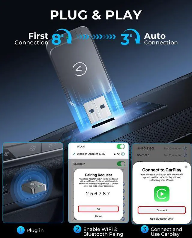 Plug & Play: Get started quickly with wireless carplay adapter in just 3 steps of setup. Once paired, the car play wireless adapter automatically reconnects every time, whether your phone is in your pocket, backpack, or outside the car
