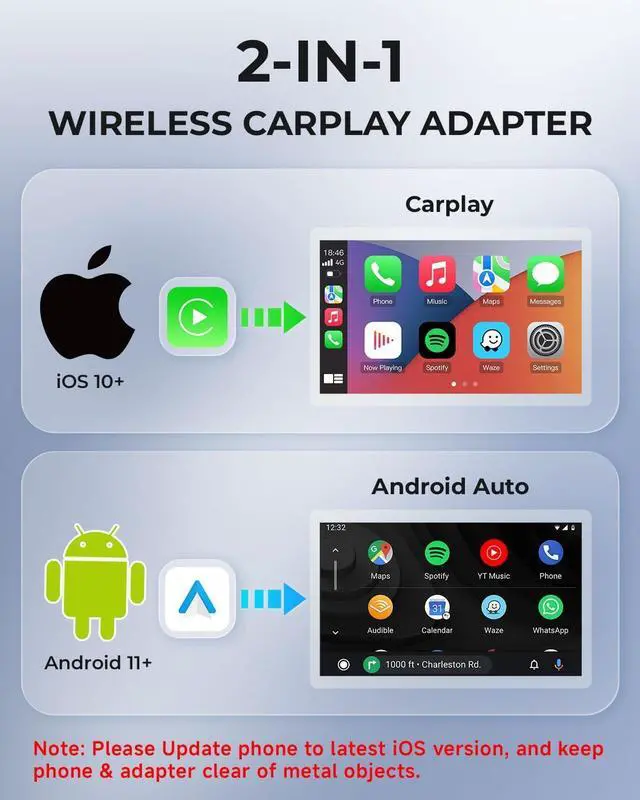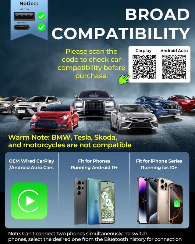Wide Compatibility: The wireless carplay adapter is compatible with iPhone 6 & later models running iOS 10 or above, as well as Android phones running Android 11 or above, enabling effortless switching between different operating systems