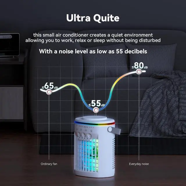 Ultra-Quiet & Humanized DesignThe air fan with a exclusive way to control the noise when it works, doesnt bother you whether youre working or sleeping. Size 7.7 x 5.4 x 10.1 inches fits nicely on your desk, coffee table, night stand etc. The handle design allows you to carry it easily and use it at anytime and in anywhere, which will accompany you on Summer.