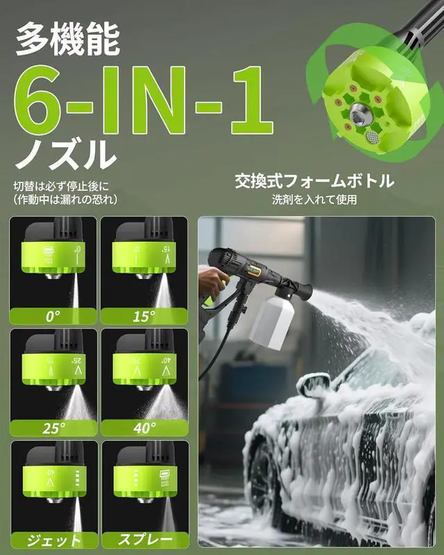 [Advanced 6-in-1 Nozzle & Foam Pot] Our upgraded 6-in-1 nozzle offers a full range of spray patterns: 0°, 15°, 25°, 40°, concentrated jet, and shower mode, making it versatile for all cleaning scenarios. Perfect for cars, bikes, walls, windows, and hard-to-reach corners, it also includes a foam pot for efficient foaming, ideal for removing tough stains. Enhanced for convenience and performance, this nozzle provides everything you need for efficient versatile cleaning tasks.