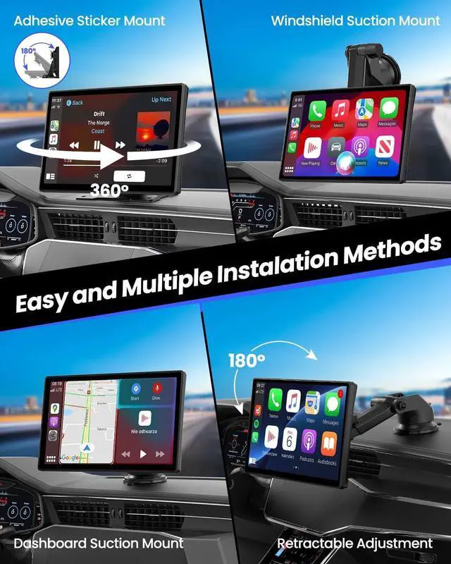 [Easy Installation]: The wireless carplay equipped with a extendable suction cup bracket and a self-adhesive bracket, it easily secures to the dashboard or windshield, allowing convenient detachment and installation. Simply insert it into the cigarette lighter socket to use