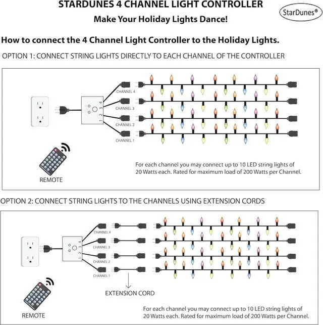 MAKE YOUR HOME STAND OUT: Create dazzling light displays. Easy to use just plug your holiday lights to the Controllers 4 channels. The channels are numbered 1 to 4. To get chasing effects the decorations should be connected to the Controller in the sequential order 1 to 4. 9 professional level functions (Chasing, Twinkle, Shooting Star, Stacking, Slow Glow, Sparkle, and various combinations including speed control. ).