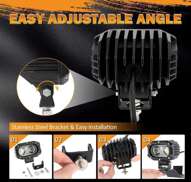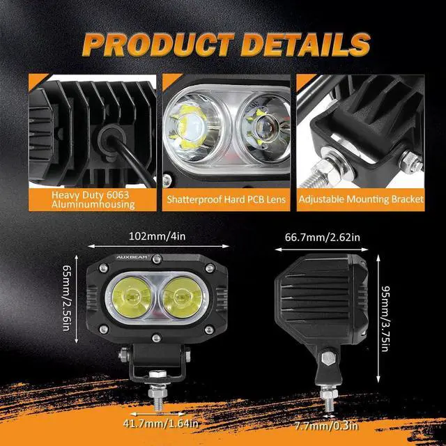 UNIVERSAL AUXILIARY LIGHTSFit for all 9-30V DC vehicles and boats. The led light pods can be installed in any location and any kind of cars, Off Road Vehicles, ATVs, UTVs, SUVs, Construction Vehicles, Farm Vehicles, Trucks, Motorcycles, Buses, Boats, etc. Great for fog lamps, ditch lights, rear work lights, driving lights, headlights, work lights, off road lights, backup reverse lights, search lights and more.