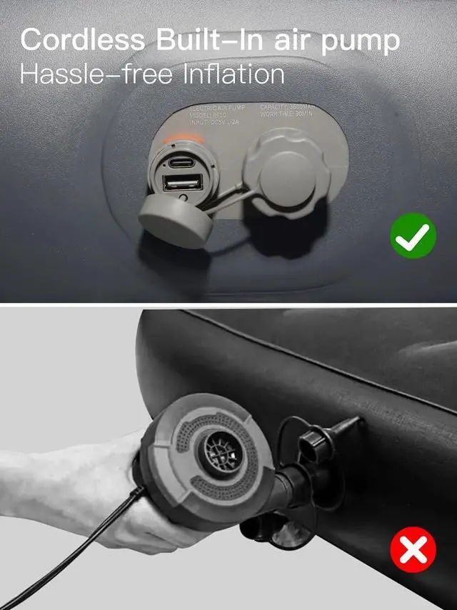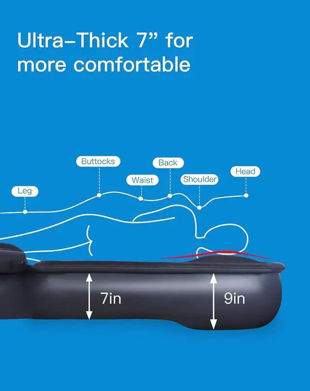 Elevated Head Design & Air Mattress Wings: The built-in pillow provides extra comfort with a 9-inch height at the top, gradually decreasing to 7 inches for the rest of the mattress. The unique "SUV air mattress wings" at the sides fit perfectly around the wheel arches, offering full-body protection and comfort