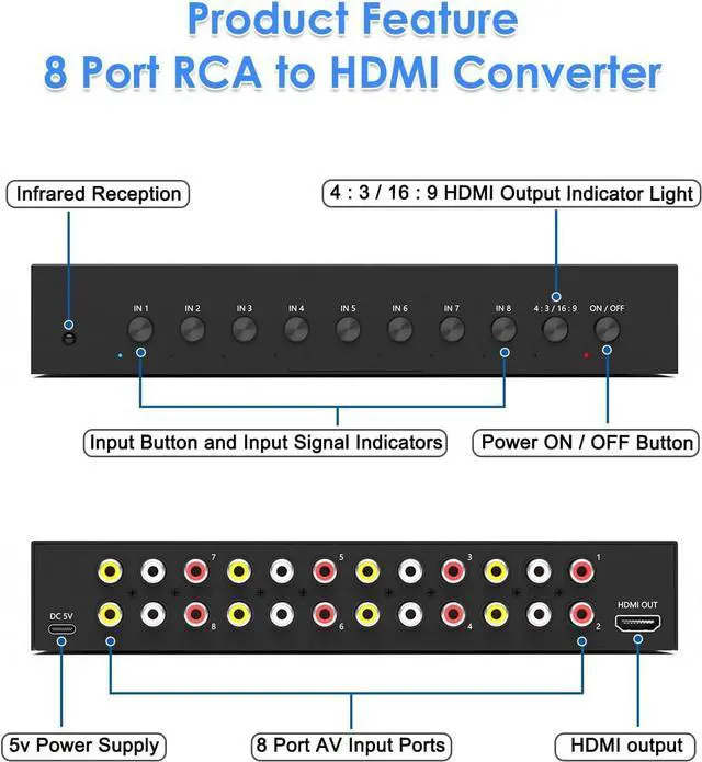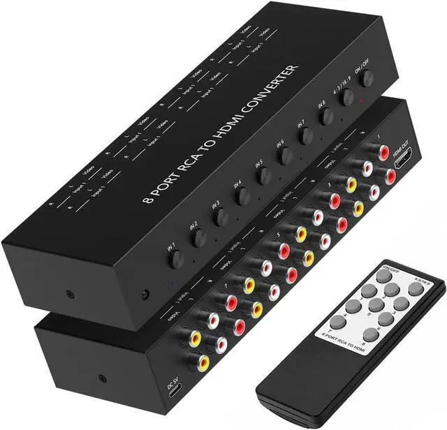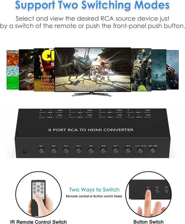 SUPPORT 2 SWITCHING METHODS Button Switch; IR Remote Control Switch; You can press the switch button on the box and select the exact input you want. If you are some distance away from the rca to hdmi converter, then you can also control rca to hdmi converter via the IR remote, switch the rca sources without leaving your comfortable seat. Select and view the desired rca source device just by a switch of the remote or push the front-panel push button.