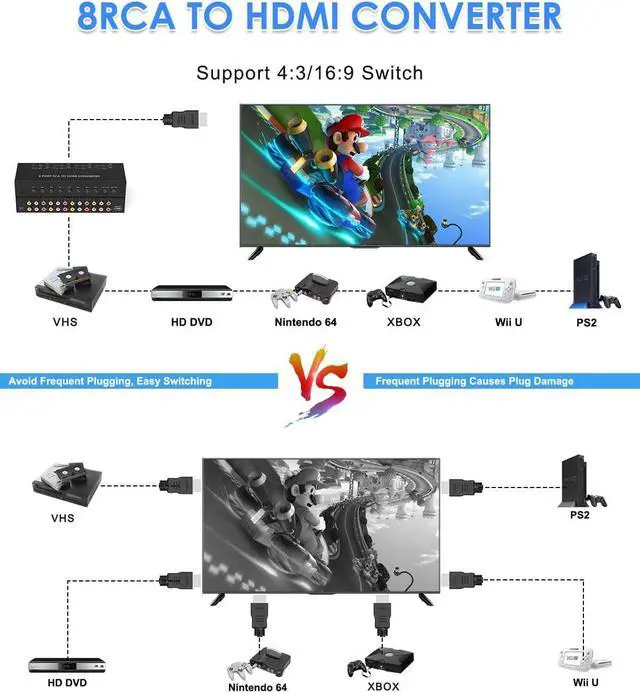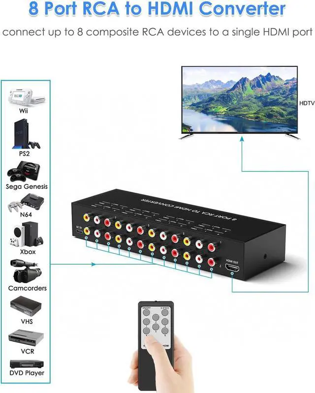 WIDE COMPATIBILITY8 port RCA to HDMI converter is a device that allows you to connect up to four RCA (Red, White, Yellow) devices to a single HDMI port on a TV or other display device. suitable for a variety of old devices that use RCA cables, such as VCRs, DVD players, and analog gaming consoles like Sega Genesis, PS 1, PS 2, PS 3, Wii, and N64. It can also work with some video recording devices, such as VHS and camcorders.