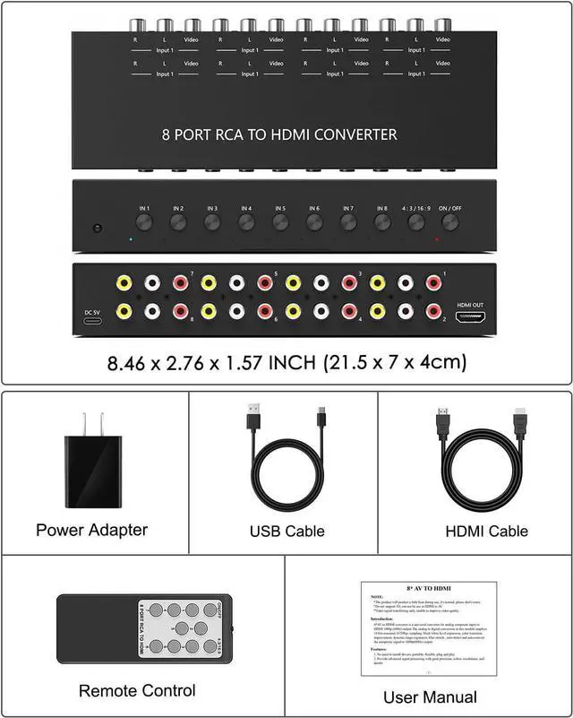 Package Content: 1x 8 Port RCA to HDMI converter, 1 x Power Adapter, 1 x USB Cable, 1x HDMI Cable, 1 x Remote Control, 1 x User Manual.