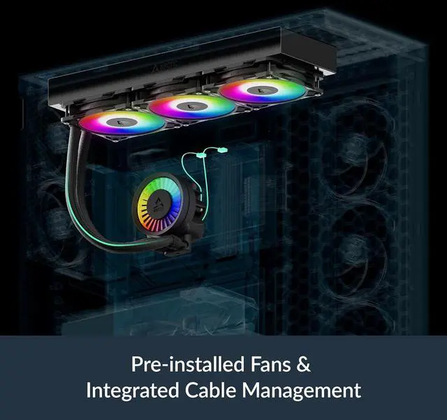 INTEGRATED CABLE MANAGEMENT: The PWM cables of the radiator fans are integrated into the sleeve of the tubes, so only a single visible cable connects to the motherboard