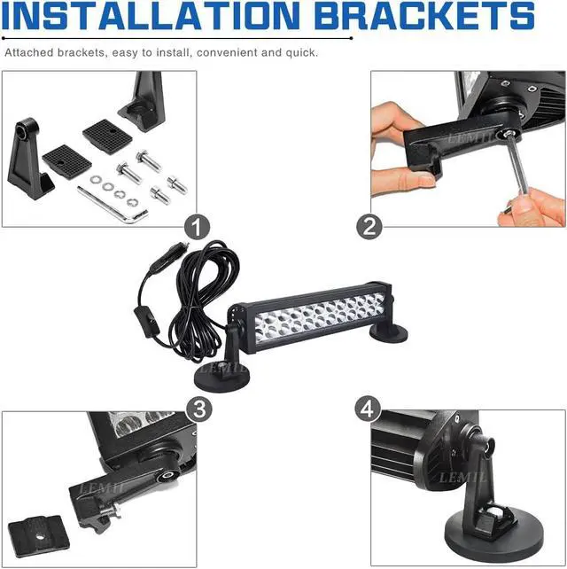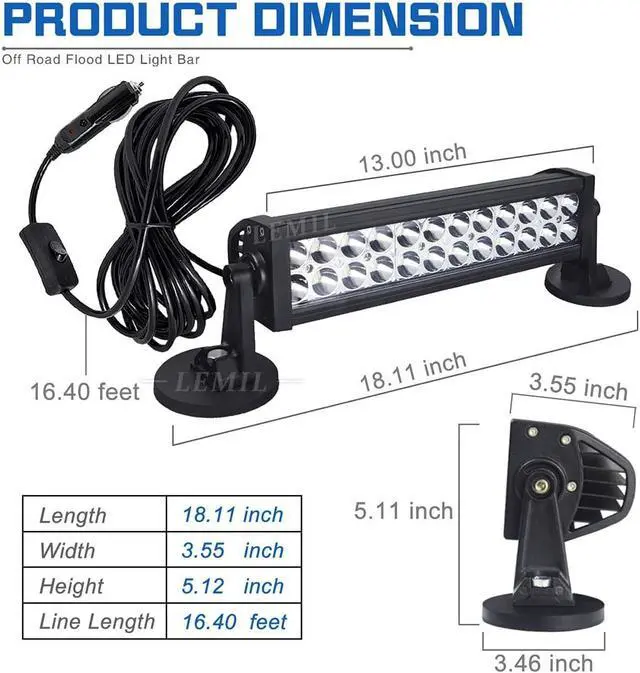 LEMIL L5B01 72W high brightness double row Led Light Bar. The light is designed with a DC charger for power supply, with rocker switch, with the magnetic base. L5B01 series was designed to improve the brightness for all customers during the night off road driving. L5B01 series is popular among all our customers for its high quality and affordable prices. The decent size and design give an excellent appearance when you install on your vehicle.