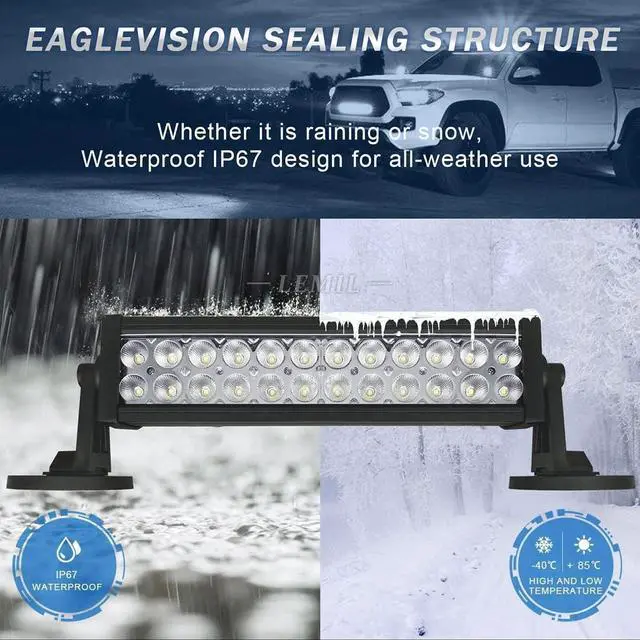 High intensity chip: C-R-E-E3. New desine of PMMA lens. More bright. 4. 100% Aluminum housing. Excellent more area heat dissipation5. 16.4 ft length, 5.8 mm diameter high toughness cable6. Strict quality control. High quality screws&aluminum housingetc. 7. Waterproof IP67, Dustproof& Quakeproof for extreme environmentPackage- 1*72W LED Work Light- 2*Magnetic Bracket