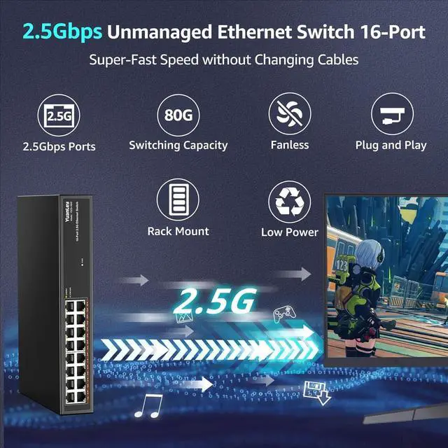Flexible for Any 2.5G SetupWhether wall-mounted or desktop-mounted, this 2.5G bps switch is a versatile solution for a wide range of 2.5G Ethernet applications. Perfect for 2.5G NAS, 4K streaming, gaming PCs, 2.5G WiFi 6 access points, 2.5G PCIe adapters, and small office networks.